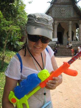 Well, we arrived in Luang Prabang (LPB), to the biggest waterfight I have ever seen. Yep, Laos New Year ( Pi Mai) is in full swing here in Luang Prabang. There were people throwing water on cars as they drove by, on people as they walked past, and on each other when there was no-one else around. There were people walking around with water pistols, locals & tourists, just shooting each other. Ute fulls of people were driving around town, music blaring, throwing water out the back of the ute, and having water thrown at them. People soaking wet & covered in mud, flour or assorted coloured powered were drinking & walking around the streets. Everyone was delieriously happy & having a great time. Except us. The festivities had caused a traffic nightmare in this small town with narrow streets, so what should have taken 10mins,