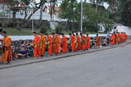 One of the local traditions in LPB is the morning ritual of monks collecting alms. At 6am every morning, monks in saffron orange robes walk the streets, and the locals offer gifts of food. Usually sticky rice, biscuits, fruit etc. The monks walk barefoot & silent along the road, while the locals kneel or on mats on the footpath with basket of offerings. They give something to each one who walks past, usually touching it to their head first (the spiritally highest point of a person) before dropping it into the monks collection basket. The monks we saw were aged anything from maybe 8, to 80. It seems that they come from the ‘home’ temple, and walk streets close to them. There was a heap of different groups of them, in different areas around town. According to locals, there are about 200 that come out every morning. It was very cool to see. In amongst the locals giving alms, local beggers sit, mainly kids & women, & the monks can give some of their offerings to these people, which they do, even the younger monks.