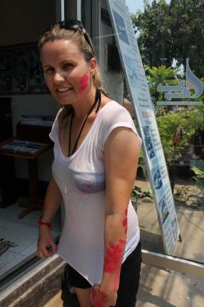 So, we hooked up with a group of foreigners who had befriended a local with a hose. All the locals here pull out a hose and let in run all day, so people can fill buckets, waterpistols, and waterever else is lying around. For about 4 hours it was traffic chaos in the main st, with utes full of people drinking, dancing & throwing water. One ute got creative & lined the ute tray with plastic, then filled it with water, sat in it, & scooped water out at people as they went along. The rest had 44 gallon drums of water in the back, & kids with powdered dye on their hands, who would reach out to rub it on your face. I became all colours of the rainbow. By the end of the day, my white shirt was pink, orange & bright green. I had black grease smeared down one side of my face, & flour through my hair…which of course turns to glue when mixed with water. A great look…especially knowing I would have to wear that look for a bit, the town runs dry on water after the festival, so no showers!