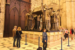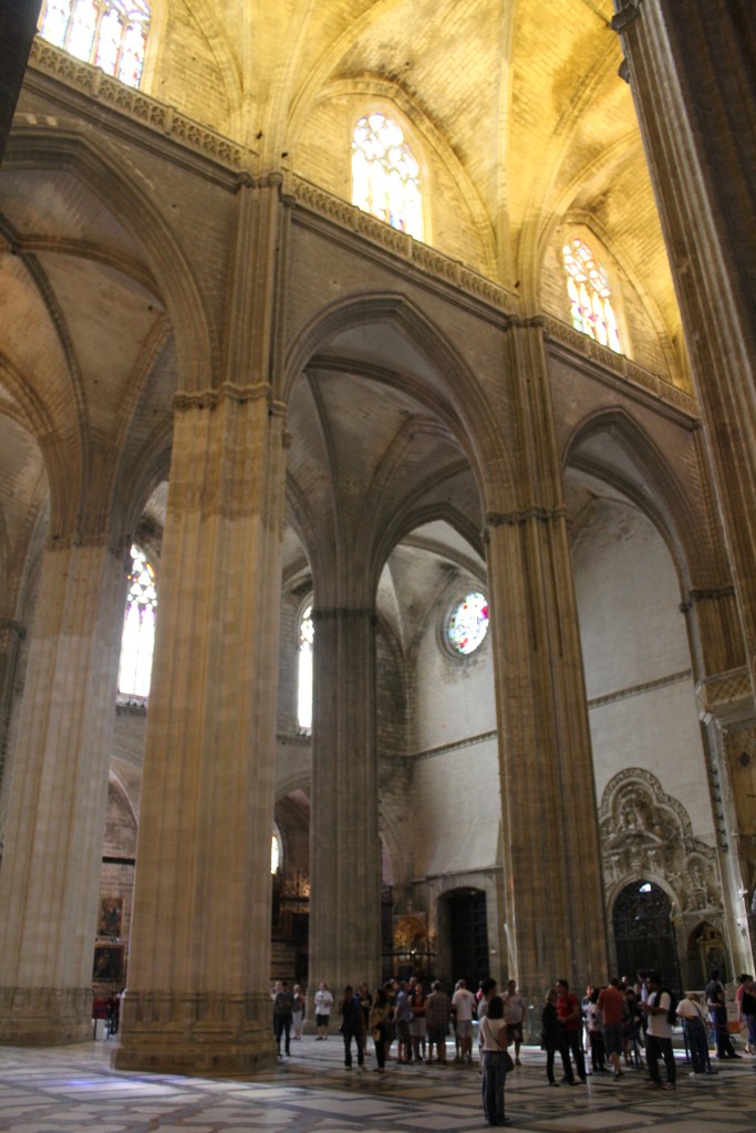 Saturday, my last day in Spain! I met Mehdi for a late breakfast (bread & tomatoes – so much bread here!) then some shopping. For the first time I noticed the amount of orange trees lining the street – one of the things Seville is famous for.  We parted ways and I became a tourist again, and visited the Cathedral. It is one of the largest gothic cathedrals in the world. Inside was dark and impressive. There are crypts of Saints and others along the walls throughout the cathedral under the stone floor, including Christopher Columbus’s…or so they will argue. Other reports say it has moved several times and could be in any number of other places around the world.